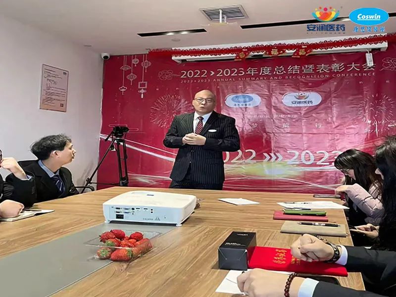沙总从三个大部分对本次年会做了一个结束性总结。一是回顾,沙总从业务和社会层面上对2022年做了一个整体回顾,总结了2022年康思伟的业务上阶段性目标圆满达成,同时在社会上康思伟也做出了一定贡献,设立了康思伟奖学金,体现了康思伟的兼济天下的社会责任感。二是简单点评了员工的年终总结,表示希望大家对年终总结要重视,对自我的总结提升是非常重要的。三是对2023年康思伟的展望,主要宣布了2023年公司内部制度的更新改革、福利制度的落实以及告知公司在未来的战略方向-挖掘更多优质产品。